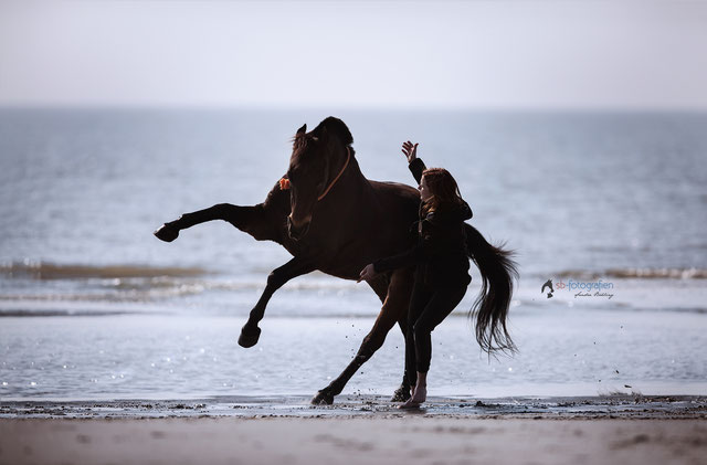 Seit 2007 arbeite ich mit Ebony in den Bereichen Natural Horsemanship, Zirzensik und Freiheitsdressur. Heute sind wir ein eingespieltes Team, und natürlich ist auch Reiten längst wieder möglich. In der Freiheitsdressur verzichten wir komplett auf Hilfsmittel wie Strick oder Halfter – Ebony zeigt zahlreiche Zirkuslektionen wie Steigen, Hinlegen und vieles mehr.